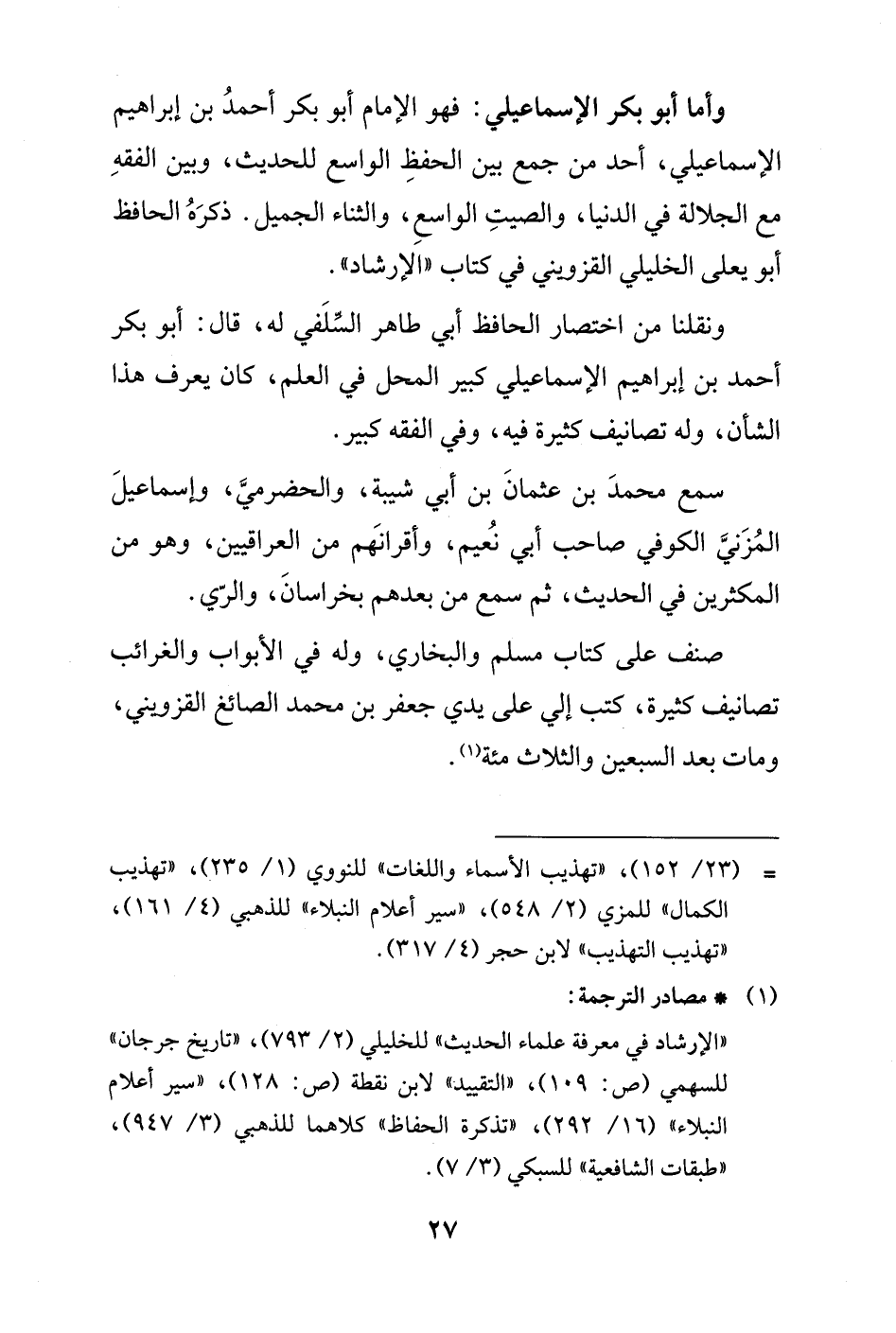 ونقلنا من اختصار الحافظ أبي طاهر السِّلَفي له، قال: أبو بكر أحمد بن إبراهيم الإسماعيلي كبير المحل في العلم، كان يعرف هذا الشأن، وله تصانيف كثيرة فيه، وفي الفقه كبير.