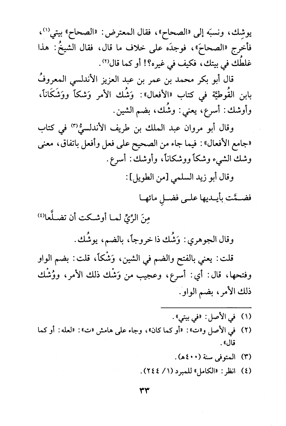قال أبو بكر محمد بن عمر بن عبد العزيز الأندلسي المعروفُ بابن القُوطيَّة في كتاب "الأفعال": وَشُك الأمر وَشكاً ووَشَكَاناً، وأوشك: أسرع، يعني: وشُك، بضم الشين.