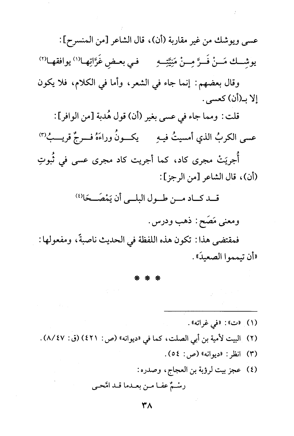 عسى ويوشك من غير مقاربة (أن)، قال الشاعر [من المنسرح]: