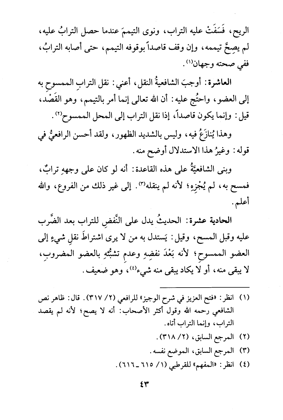 العاشرة: أوجبَ الشافعيةُ النقل، أعني: نقل الترابِ الممسوحِ به إلى العضو، واحتُج عليه: أن الله تعالى إنما أمر بالتيمم، وهو القَصْد، قيل: وإنما يكون قاصداً، إذا نقل التراب إلى المحل الممسوح (¬2).