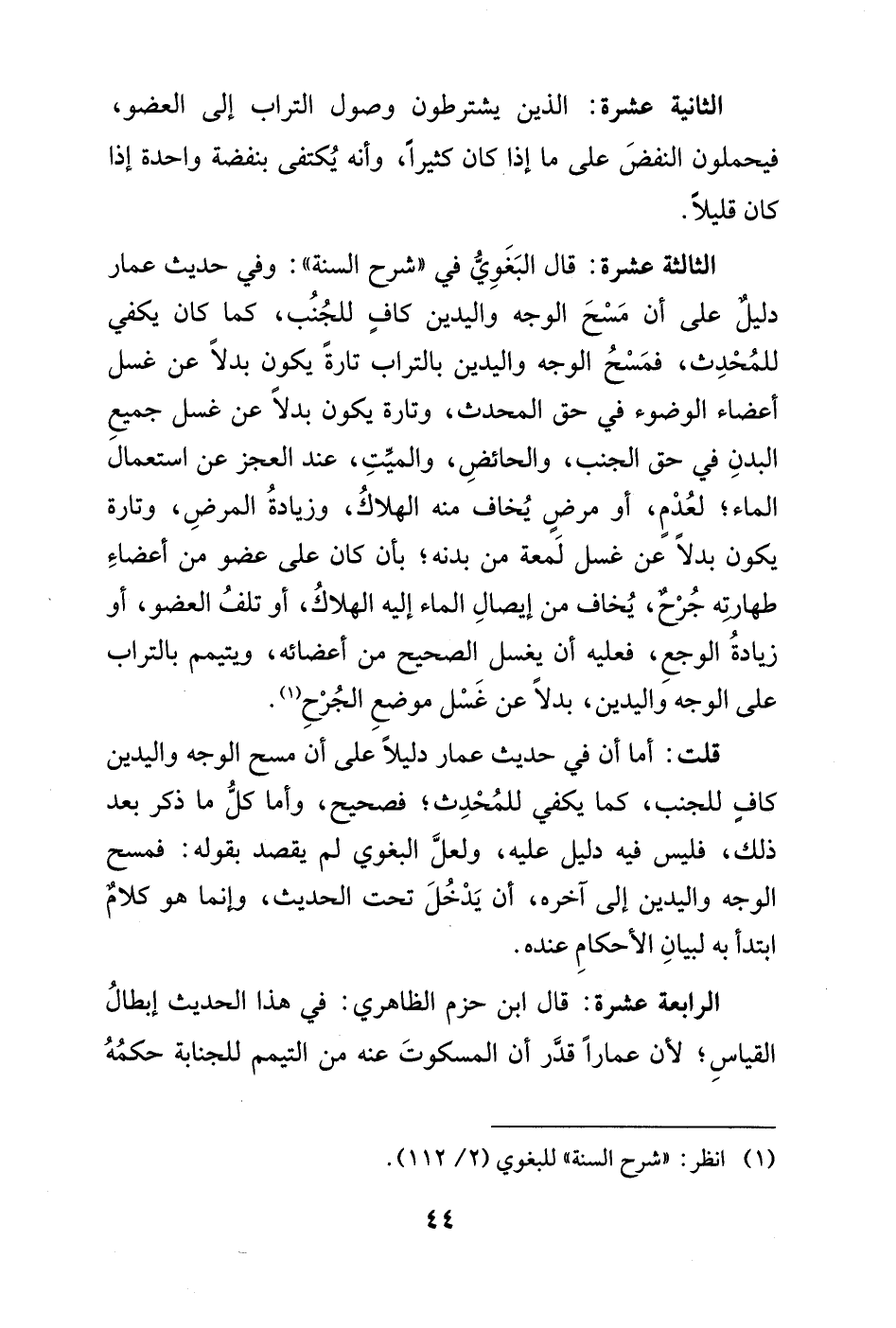 قلت: أما أن في حديث عمار دليلاً على أن مسح الوجه واليدين كافٍ للجنب، كما يكفي للمُحْدِث؛ فصحيح، وأما كلُّ ما ذكر بعد ذلك، فليس فيه دليل عليه، ولعلَّ البغوي لم يقصد بقوله: فمسح الوجه واليدين إلى آخره، أن يَدْخُلَ تحت الحديث، وإنما هو كلامٌ ابتدأ به لبيانِ الأحكامِ عنده.