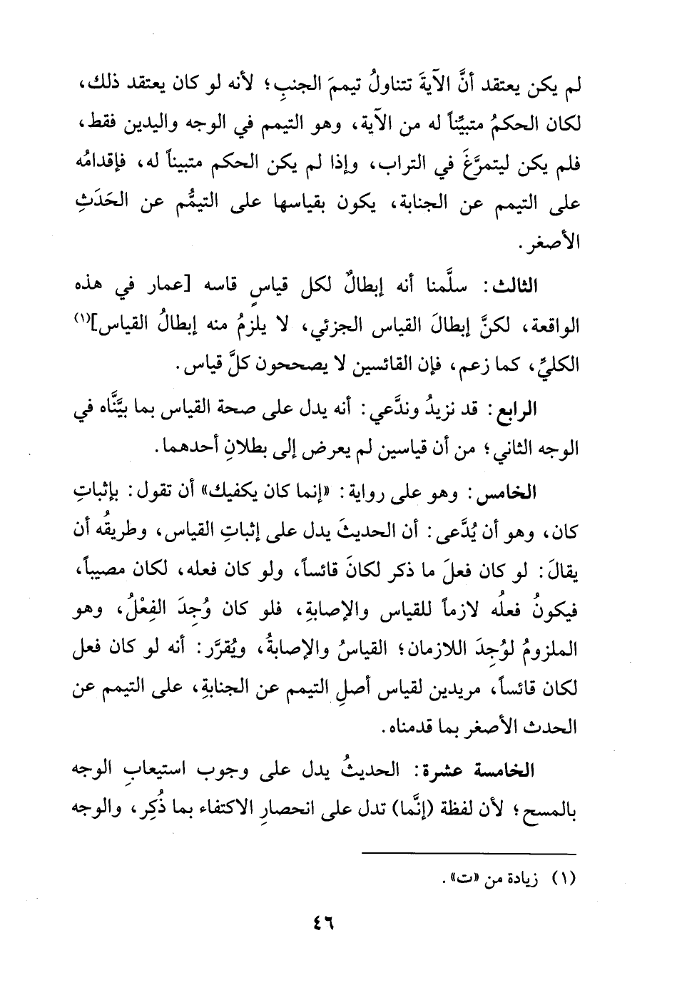 الخامس: وهو على رواية: "إنما كان يكفيك" أن تقول: بإثباتِ كان، وهو أن يُدَّعى: أن الحديثَ يدل على إثباتِ القياس، وطريقُه أن يقالَ: لو كان فعلَ ما ذكر لكانَ قائساً، ولو كان فعله، لكان مصيباً، فيكونُ فعلُه لازماً للقياس والإصابةِ، فلو كان وُجِدَ الفِعْلُ، وهو الملزومُ لوُجِدَ اللازمان؛ القياسُ والإصابةُ، ويُقرَّر: أنه لو كان فعل لكان قائساً، مريدين لقياس أصلِ التيمم عن الجنابةِ، على التيمم عن الحدث الأصغر بما قدمناه.