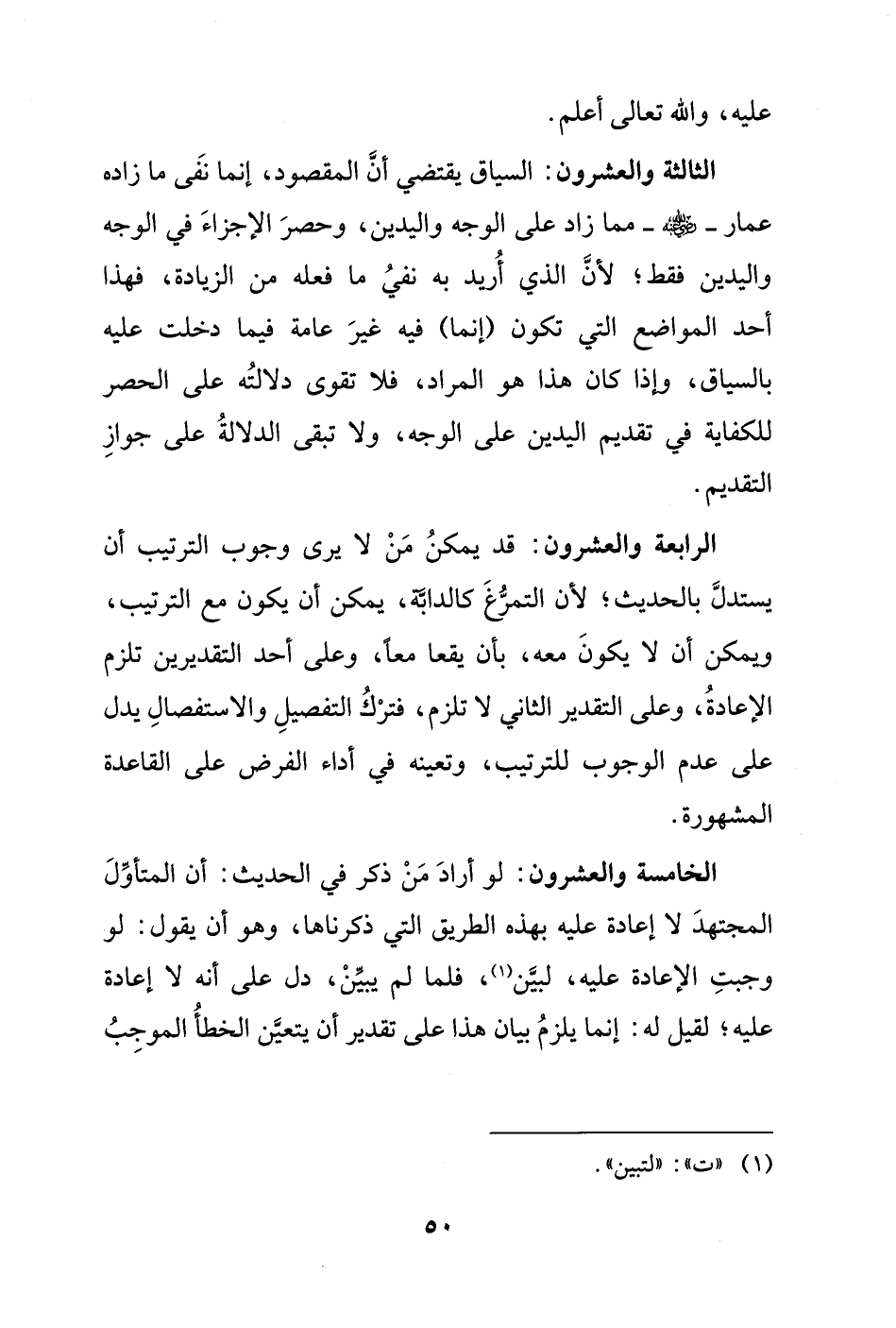 الثالثة والعشرون: السياق يقتضي أنَّ المقصود، إنما نَفى ما زاده عمار - رضي الله عنه - مما زاد على الوجه واليدين، وحصرَ الإجزاءَ في الوجه واليدين فقط؛ لأنَّ الذي أُريد به نفيُ ما فعله من الزيادة، فهذا أحد المواضع التي تكون (إنما) فيه غيرَ عامة فيما دخلت عليه بالسياق، وإذا كان هذا هو المراد، فلا تقوى دلالتُه على الحصر للكفاية في تقديم اليدين على الوجه، ولا تبقى الدلالةُ على جوازِ التقديم.