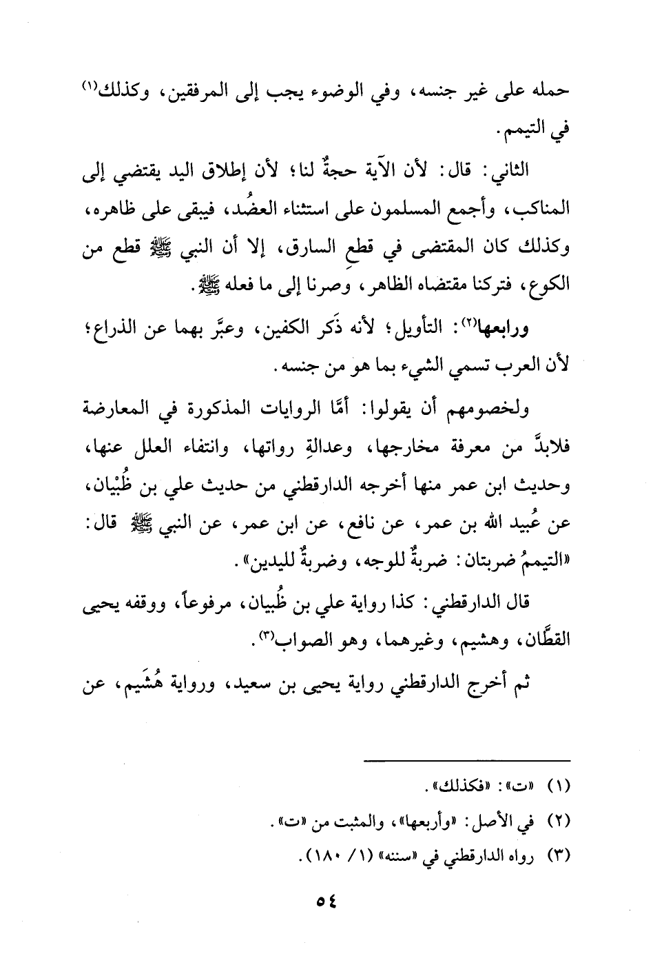 ورابعها (¬2): التأويل؛ لأنَّه ذَكر الكفين، وعبَّر بهما عن الذراع؛ لأنَّ العرب تسمي الشيء بما هو من جنسه.