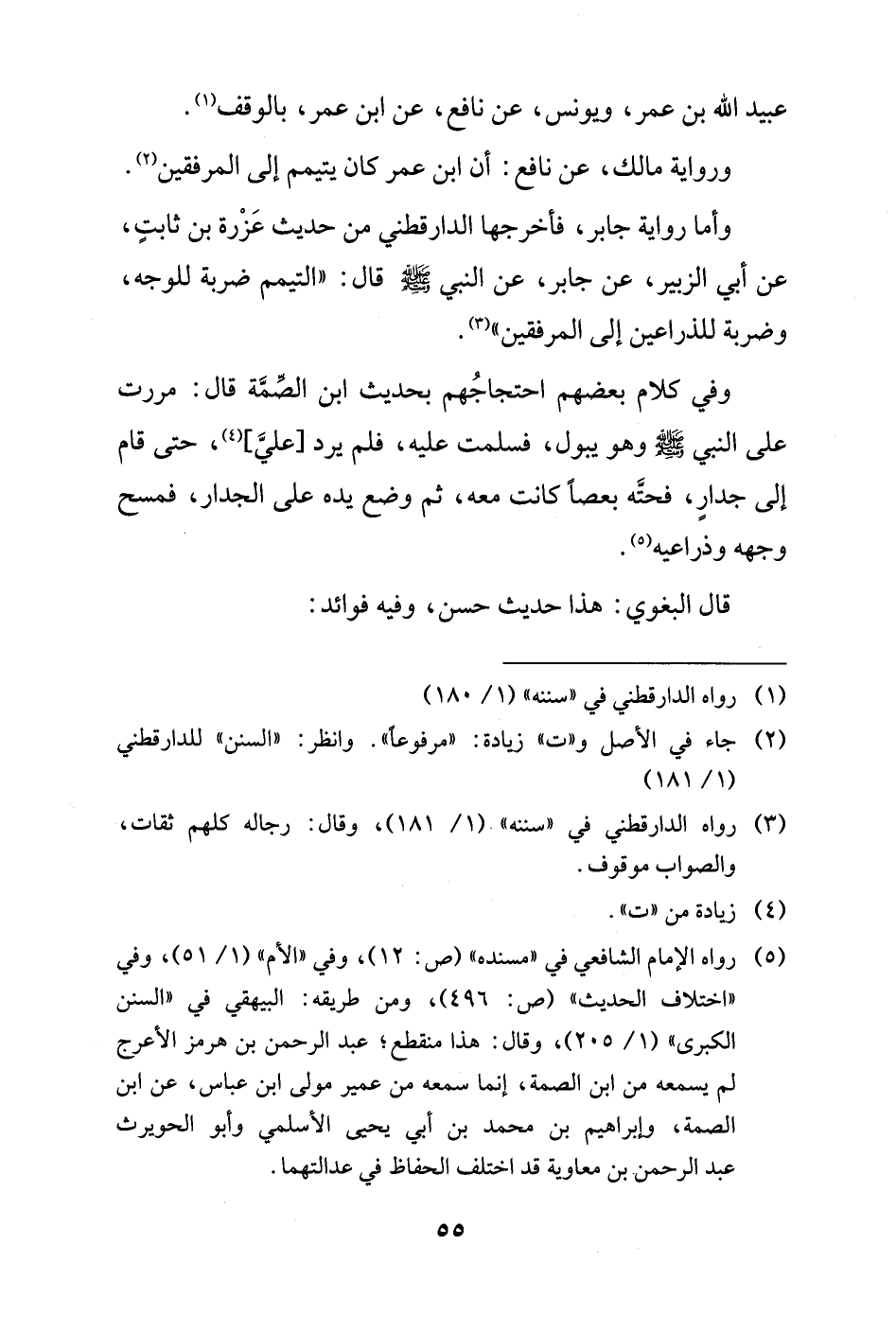 وفي كلام بعضهم احتجاجُهم بحديث ابن الصِّمَّة قال: مررت على النَّبيُّ - صَلَّى الله عليه وسلم - وهو يبول، فسلمت عليه، فلم يرد [عليَّ] (¬4)، حتَّى قام إلى جدارٍ، فحتَّه بعصاً كانت معه، ثم وضع يده على الجدار، فمسح وجهه وذراعيه (¬5).