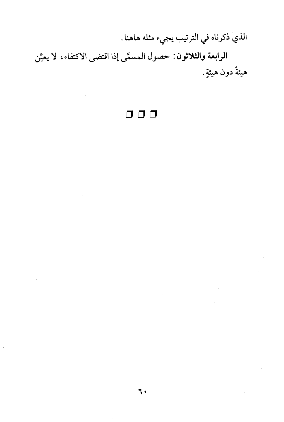 الرابعة والثلاثون: حصول المسمَّى إذا اقتضى الاكتفاء، لا يعيِّن هيئةً دون هيئةٍ.