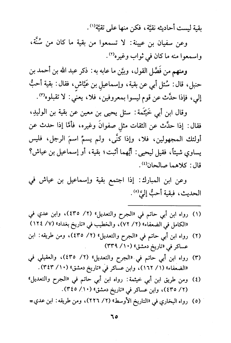 ومنهم من فَصَّل القول، وبيَّن ما عابه به: ذكر عبد الله بن أحمد بن حنبل، قال: سُئل أبي عن بقية، وإسماعيلِ بن عَيَّاشٍ، فقال: بقية أحبُّ إلي، فإذا حدَّث عن قوم ليسوا بمعروفين، فلا، يعني: لا تقبلوه (¬3).