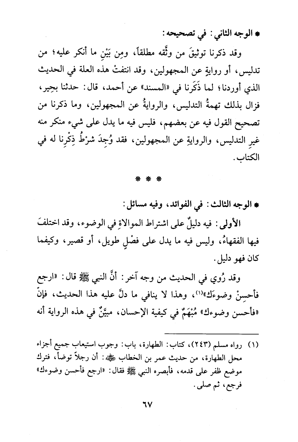 (¬1) رواه مسلم (243)، كتاب: الطهارة، باب: وجوب استيعاب جميع أجزاء محل الطهارة، من حديث عمر بن الخطاب - رضي الله عنه -: أن رجلًا توضأ، فترك موضع ظفر على قدمه، فأبصره النَّبيُّ - صلى الله عليه وسلم - فقال: "ارجع فأحسن وضوءك" فرجع، ثم صَلَّى.