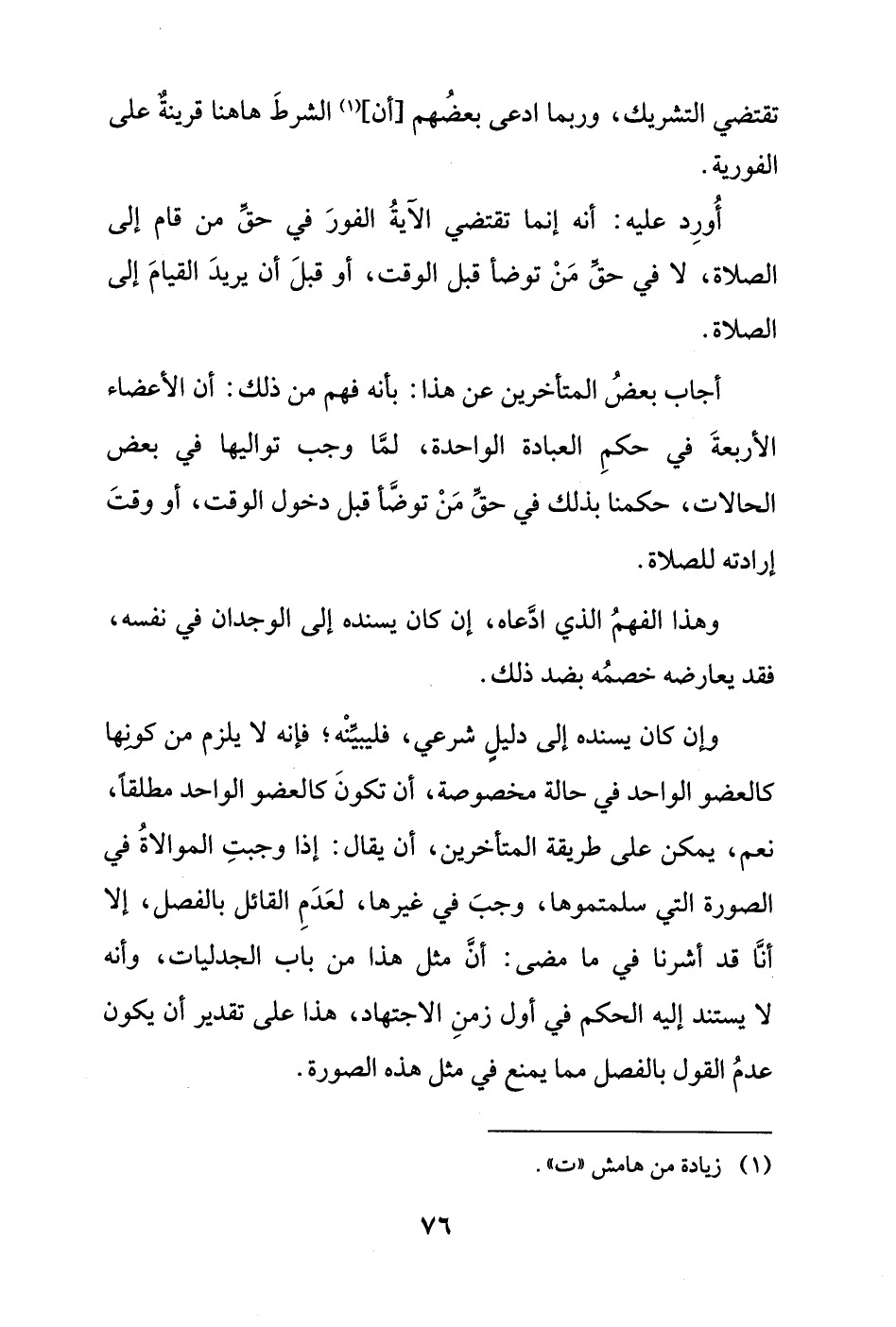 وإن كان يسنده إلى دليلٍ شرعي، فليبيِّنْه؛ فإنَّه لا يلزم من كونِها كالعضو الواحد في حالة مخصوصة، أن تكونَ كالعضو الواحد مطلقًا، نعم، يمكن على طريقة المتأخرين، أن يقال: إذا وجبتِ الموالاةُ في الصورة التي سلمتموها، وجبَ في غيرها، لعَدَمِ القائل بالفصل، إلَّا أنَّا قد أشرنا في ما مضى: أنَّ مثل هذا من باب الجدليات، وأنه لا يستند إليه الحكم في أول زمنِ الاجتهاد، هذا على تقدير أن يكون عدمُ القول بالفصل ممَّا يمنع في مثل هذه الصورة.