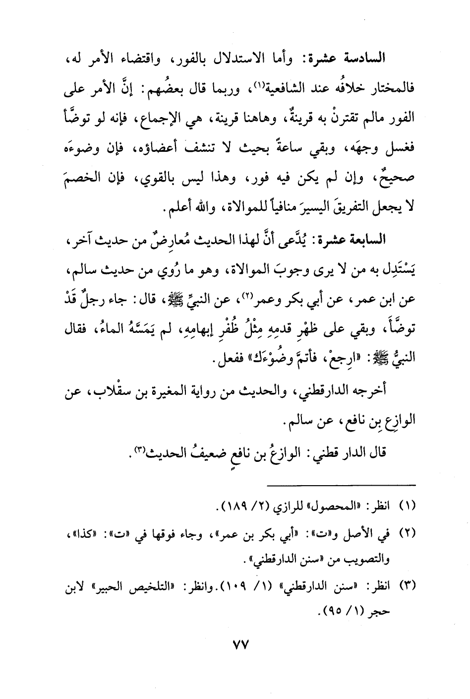 السابعة عشرة: يُدَّعى أنَّ لهذا الحديث مُعارِضٌ من حديث آخر، يَسْتَدِل به من لا يرى وجوبَ الموالاة، وهو ما رُوي من حديث سالم، عن ابن عمر، عن أبي بكر وعمر (¬2)، عن النبيِّ - صَلَّى الله عليه وسلم -، قال: جاء رجلٌ قَدْ توضَّأَ، وبقي على ظهْرِ قدمِهِ مِثْلُ ظُفْرِ إبهامِهِ، لم يَمَسَّهُ الماءُ، فقال النبيُّ - صلى الله عليه وسلم -: "ارِجعْ، فأتمَّ وضُوْءَك" ففعل.
