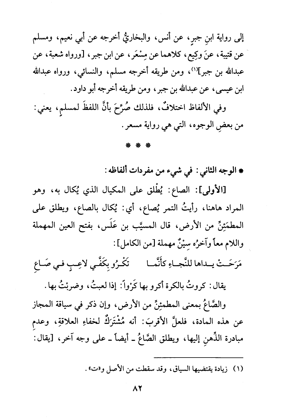 [الأولى]: الصاع: يُطْلق على المكيال الذي يُكال به، وهو المراد ها هنا، رأيتُ التّمر يُصاع؛ أي: يُكال بالصَّاع، ويطلق على المطمَئِنِّ من الأرض، قال المسيَّب بن عَلَس، بفتح العين المهملة واللام معاً وآخرُه سِيْن مهملة [من الكامل]: