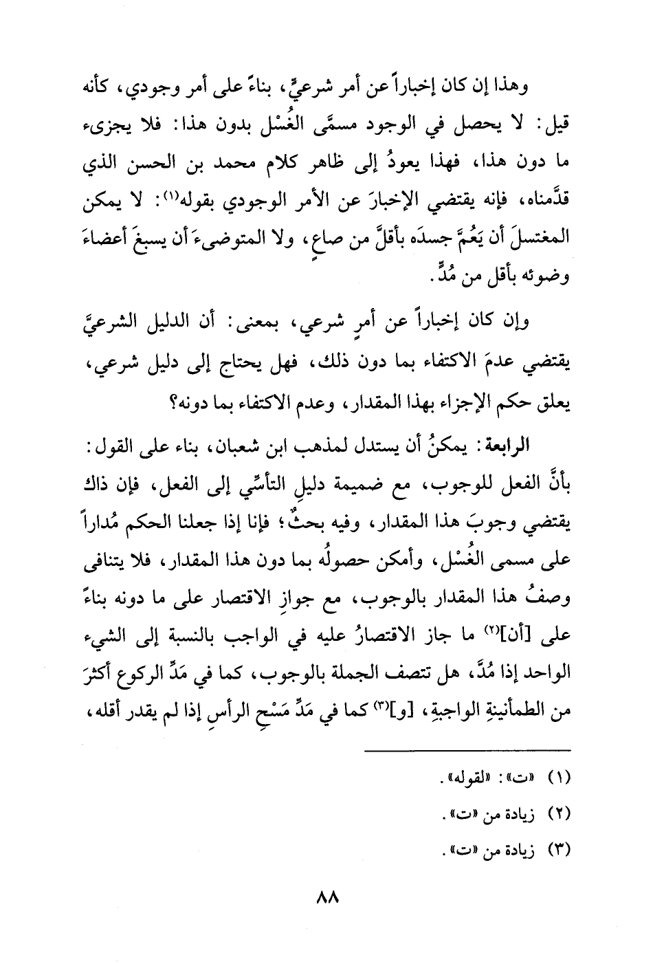 وهذا إن كان إخباراً عن أمر شرعيٍّ، بناءً على أمر وجودي، كأنه قيل: لا يحصل في الوجود مسمَّى الغُسْل بدون هذا: فلا يجزئ ما دون هذا، فهذا يعودُ إلى ظاهر كلام محمد بن الحسن الذي قدَّمناه، فإنَّه يقتضي الإخبارَ عن الأمر الوجودي بقوله (¬1): لا يمكن المغتسلَ أن يَعُمَّ جسدَه بأقلَّ من صاعٍ، ولا المتوضئَ أن يسبغَ أعضاءَ وضوئه بأقل من مُدٍّ.