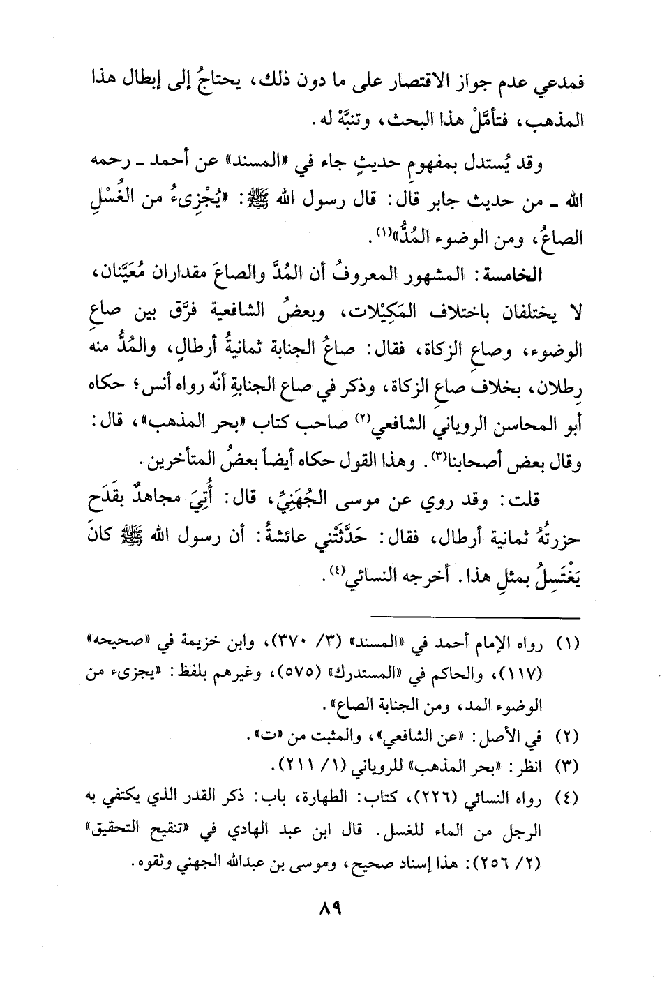 (¬4) رواه النَّسائيّ (226)، كتاب: الطهارة، باب: ذكر القدر الذي يكتفي به الرجل من الماء للغسل. قال ابن عبد الهادي في "تنقيح التحقيق" (2/ 256): هذا إسناد صحيح، وموسى بن عبد الله الجهني وثقوه.