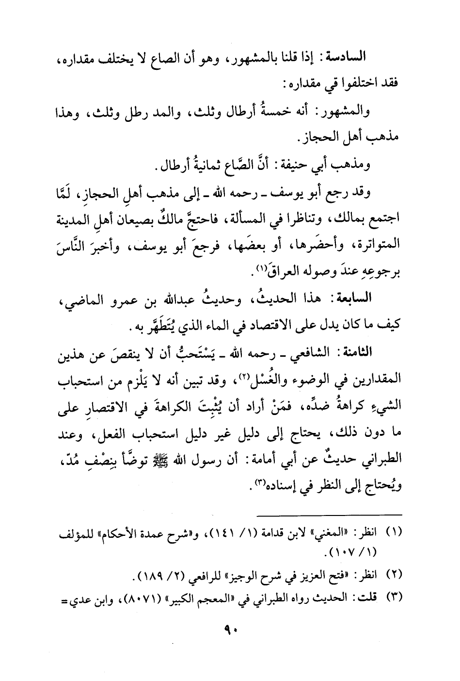 السادسة: إذا قلنا بالمشهور، وهو أن الصاع لا يختلف مقداره، فقد اختلفوا في مقداره: والمشهور: أنه خمسةُ أرطال وثلث، والمد رطل وثلث، وهذا مذهب أهل الحجاز.