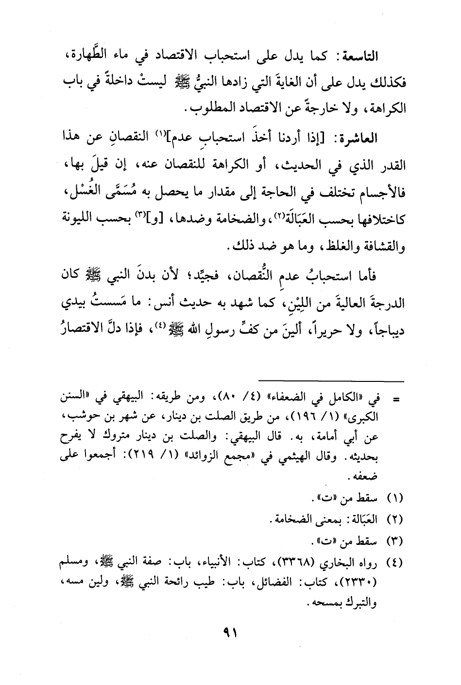 العاشرة: [إذا أردنا أخذَ استحبابِ عدم] (¬1) النقصانِ عن هذا القدر الذي في الحديث، أو الكراهة للنقصان عنه، إن قيلَ بها، فالأجسام تختلف في الحاجة إلى مقدار ما يحصل به مُسَمَّى الغُسْل، كاختلافها بحسب العَبَالَة (¬2)، والضخامة وضدها، [و] (¬3) بحسب الليونة والقشافة والغلظ، وما هو ضد ذلك.
