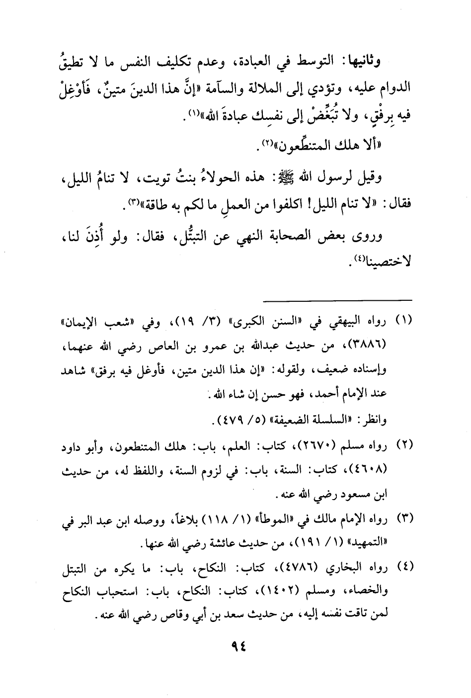 وثانيها: التوسط في العبادة، وعدم تكليف النفس ما لا تطيقُ الدوام عليه، وتؤدي إلى الملالة والسآمة "إنَّ هذا الدينَ متينٌ، فَأوْغِلْ فيه بِرفْقٍ، ولا تُبَغِّضْ إلى نفسِك عبادةَ الله" (¬1).