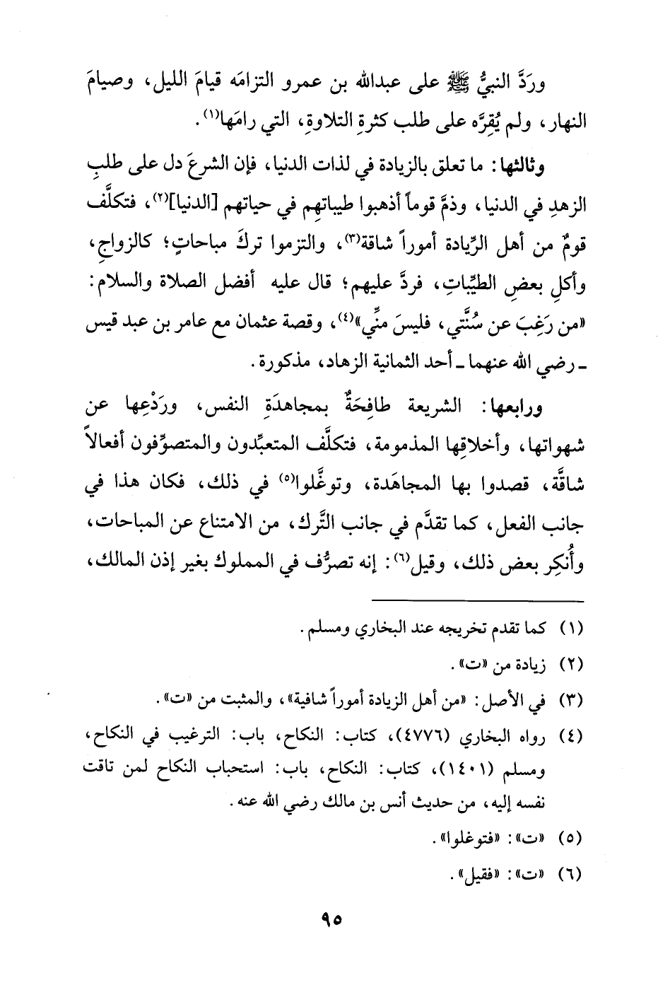 وثالثها: ما تعلق بالزيادة في لذات الدُّنيا، فإن الشَّرعَ دل على طلبِ الزهدِ في الدُّنيا، وذمَّ قوماً أذهبوا طيباتهِم في حياتهم [الدُّنيا] (¬2)، فتكلَّف قومٌ من أهل الرِّيادة أموراً شاقة (¬3)، والتزموا تركَ مباحاتٍ؛ كالزواجِ، وأكلِ بعضِ الطيِّباتِ، فردَّ عليهم؛ قال عليه أفضل الصَّلاة والسلام: "من رَغِبَ عن سُنَّتي، فليسَ منِّي" (¬4)، وقصة عثمان مع عامر بن عبد قيس - رضي الله عنهما - أحد الثمانية الزهاد، مذكورة.
