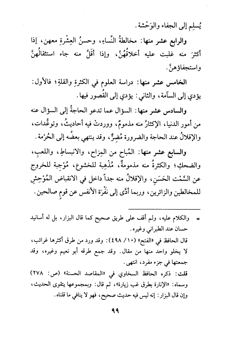 والسابع عشر منها: المُباح من المِزاح، والانبساطِ، واللعبِ، والضحكِ؛ والكثرةُ منه مذمومةٌ، مُذْهِبة للخشوع، مُوْجِبة للخروج عن السَّمْت الحَسَنِ، والإقلالُ منه جداً داخل في الانقباض المُوْحِشِ للمخالطين والزائرين، وربما أدَّى إلى نَفْرَة الأنفس عن قومٍ صالحين.