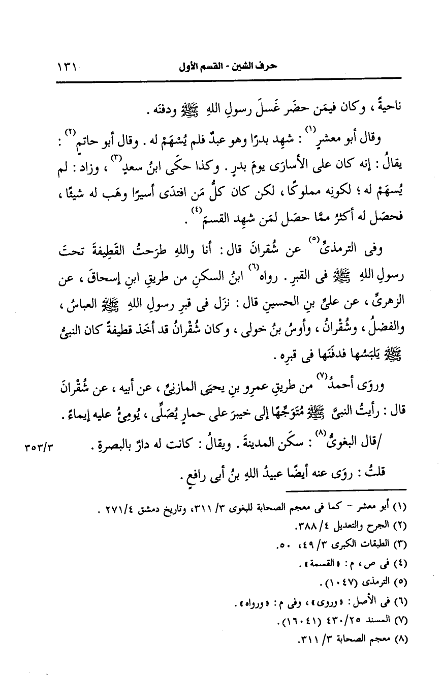وفي التِّرمِذيّ، عَن شقران قال أنا والله طرحت القطيفة تحت رسول الله صَلى الله عَلَيه وسَلم في القبر ورواه ابن السَّكَن من طريق ابن إِسحَاق، عَن الزُّهْرِيّ، عَن علي بن الحسين قال نزل في قبر رسول الله صَلى الله عَلَيه وسَلم العباس والفضل وشقران وأوس بن خولى، وكان شقران قد أخذ قطيفة كأَنَّ النَّبِيَّ صَلى الله عَلَيه وسَلم يلبسها فدفنها في قبره.