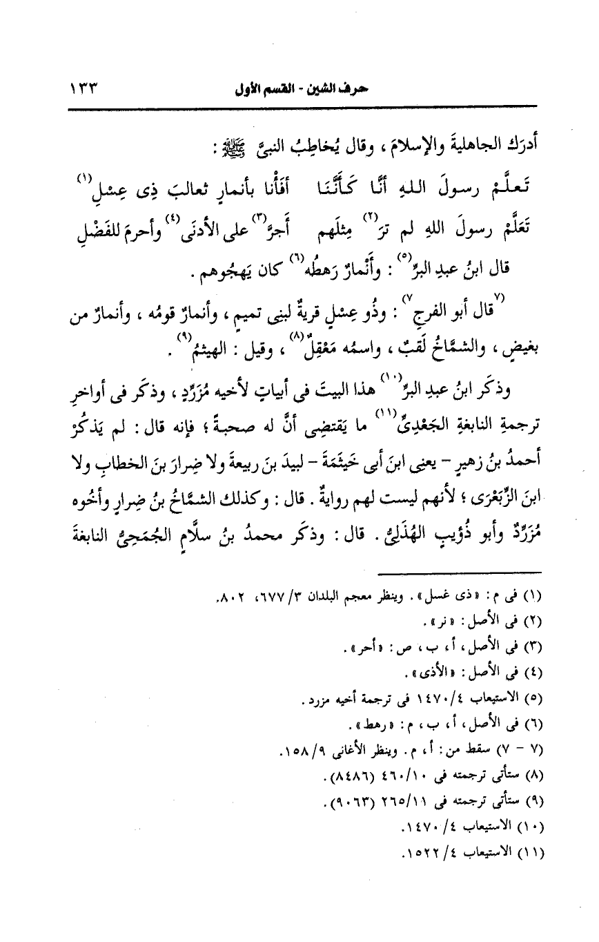 وذكر ابن عَبد البَرِّ هذا البيت في أبيات لأخيه مزرد وذكر في أواخر ترجمة النابغة الجعدي ما يقتضي أن له صُحبَةٌ فإنه قال لم يذكر أَحمد بن زهير يعني بن أبي خيثمة لبيد بن ربيعة ولا ضرار بن الخطاب ولا بن الزبعري لأنهم ليست لهم رواية قال وكذلك الشماخ بن ضرار وأخوه مزرد، وأَبو ذؤيب الهذلي قال وذكر محمد بن سلام الجمحي النابغة والشماخ ومزردا ولبيدا طبقة واحدة انتهى.