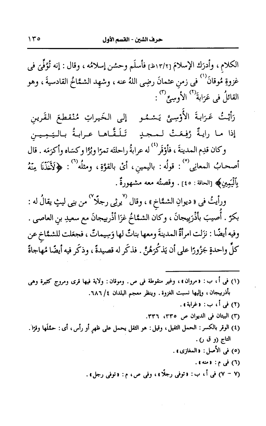 وقصته معه مشهورة ورأيت في ديوان الشماخ وقال توفي رجل من بني ليث يُقَالُ لَهُ: بكر أصيب بأذربيجان، وكان الشماخ غزا أذربيجان مع سعيد بن العاص وفيه أيضًا نزلت امرأة المدينة ومعها بنات لها وسيمات فجعلت للشماخ، عَن كل واحدة جزورا على أن يذكرهن فذكر له قصيدة وذكر فيه أيضًا مهاجاة له مع الخليج بن سويد الثعلبي وهما يسيران مع مَروان بن الحكم وهو حينئذ أمير المدينة وقال العتبي مما يتمثل به من شعر الشماخ قوله: