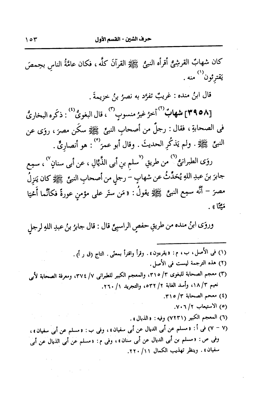 وقال أَبو عُمَر هو أنصاري روى الطبراني من طريق مسلم، عَن أبي الذيال، عَن أبي سفيان سمع جابر بن عَبد الله يحدث، عَن شهاب رجل من أصحابِ النَّبِيِّ صَلى الله عَلَيه وسَلم كان ينزل مصر أنه سمع النَّبيّ صَلى الله عَلَيه وسَلم يقول من ستر على مؤمن عورة فكأنما أحيى ميتا.
