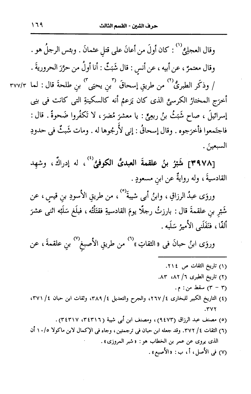 وروى عبد الرزاق، وابن أبي شيبة من طريق الأَسود بن قيس، عَن شبر بن علقمة قال بارزت رجلا يوم القادسية فقتلته فبلغ سلبه اثنى عشر ألفا فنفلني الأمير سلبه.