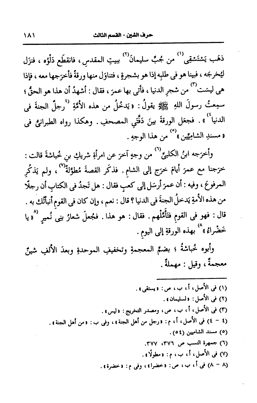 وأَخرجه ابن الكلبي من وجه آخر، عَن امرأة شريك بن خباشة قالت خرجنا مع عمر أيام خرج إلى الشام فذكر القصة مطولة ولم يذكر المرفوع وفيه أن عمر أرسل إلى كعب فقال هل تجد في الكتاب أن رجلا من هذه الأمة يدخل الجنة في الدنيا قال نعم وإن كان في القوم نبأتك به قال فهو في القوم فتأملهم فقال هو هذا فجعل شعار بني نمير خضرة بهذه الورقة إلى اليوم.