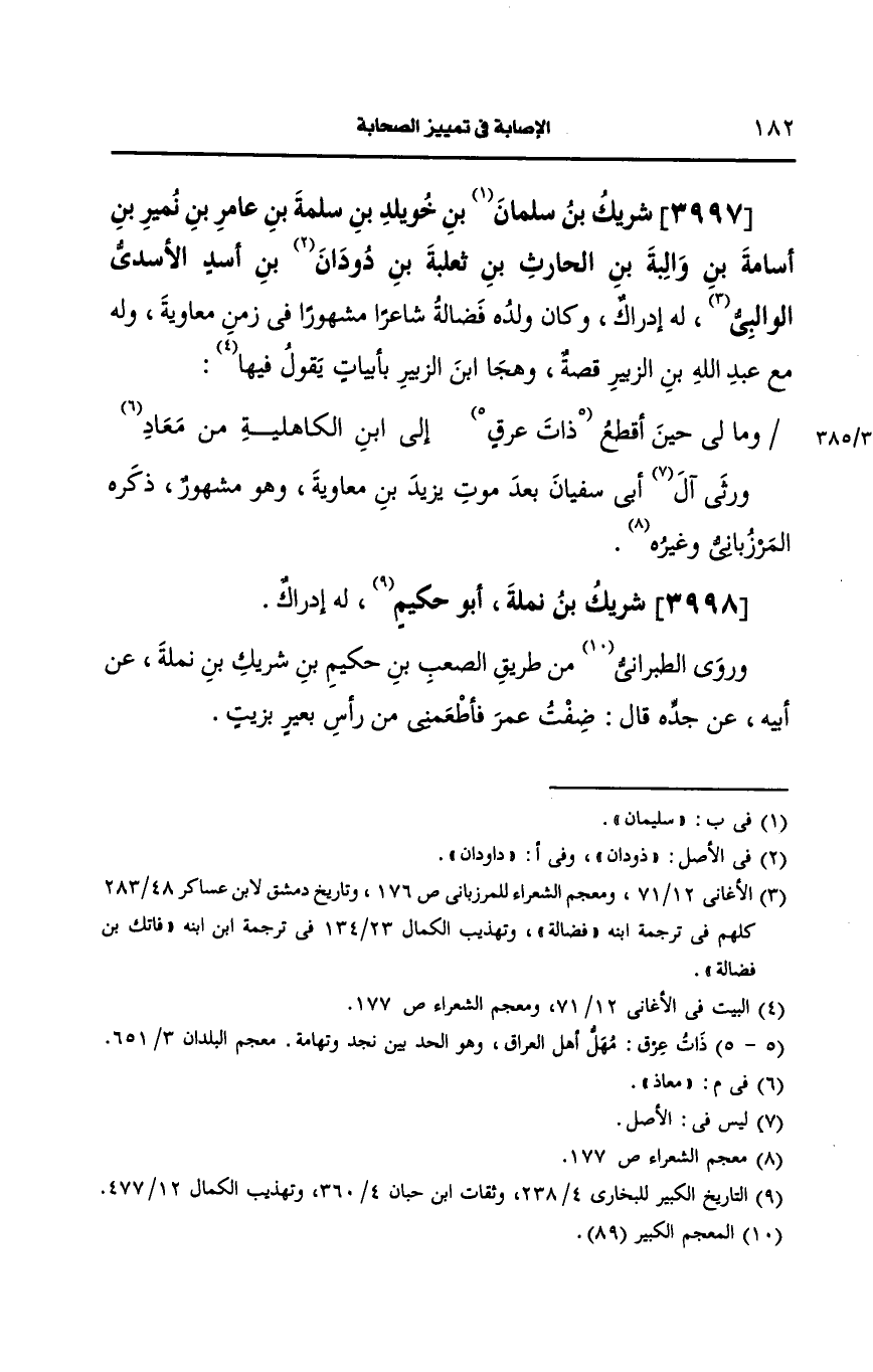 3997- (ز) شريك بن سلمان بن خويلد بن سلمة بن عامر بن نمير بن أسامة بن والبة بن الحارث بن ثعلبة بن دودان بن أسد الأسدي الوالبي.