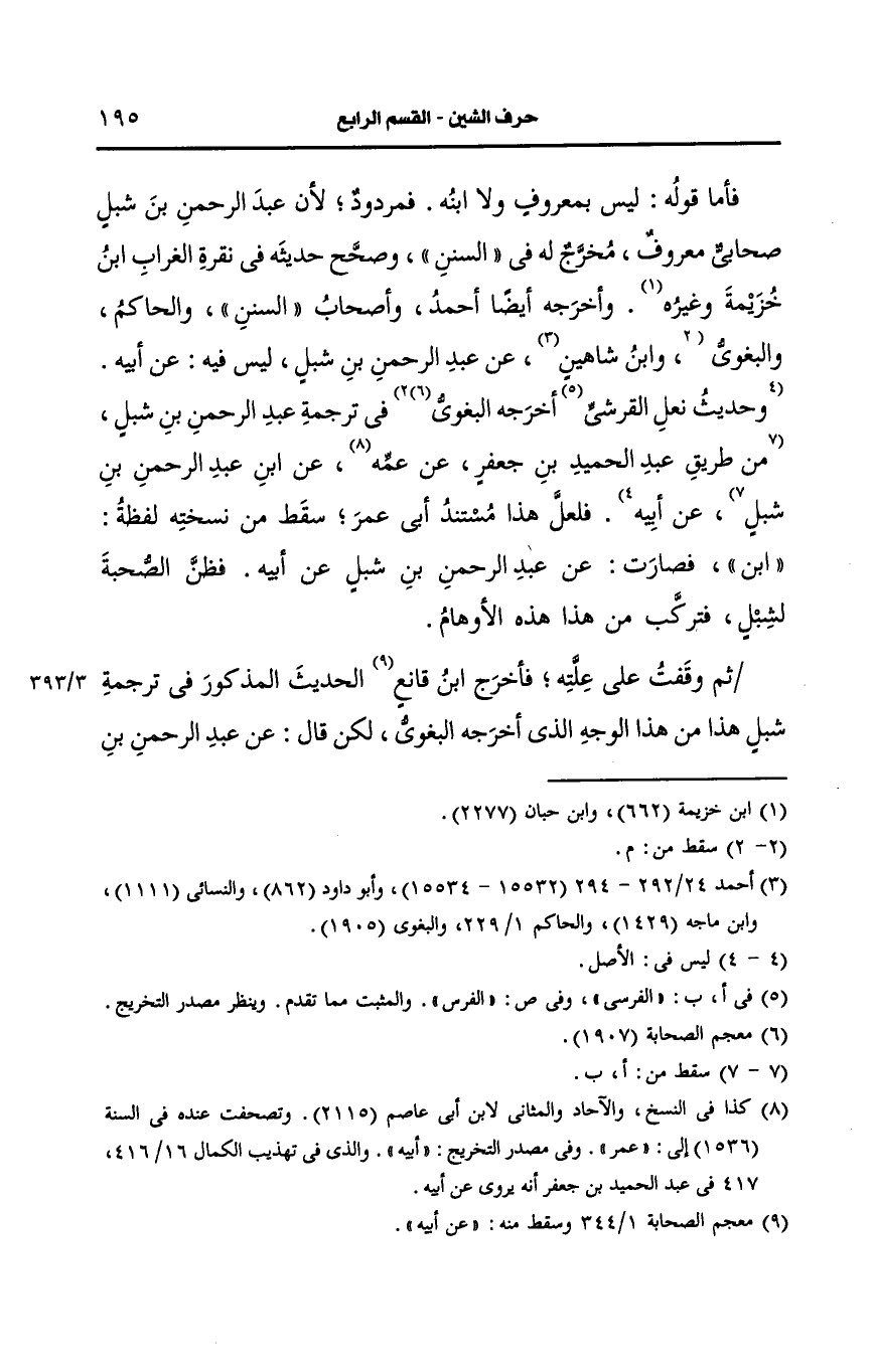 وَأَخرجَه أيضًا أَحمد وأَصحاب "السُّنَن" والحاكم والبغوي في ترجمة عبد الرحمن بن شبل من طريق عبد الحميد بن جعفر، عَن عمه، عَن ابن عبد الرحمن بن شبل، عَن أَبيه فلعل هذا مستند أبي عمر سقط من نسخته لفظ بن فصارت، عَن عبد الرحمن بن شبل، عَن أَبيه فظن الصحبة لشبل فتركب من هذا هذه الأوهام ثم وقفت على علته فأخرج بن قانع الحديث المذكور في ترجمة شبل هذا من هذا الوجه الذي أَخرجه البغوي لكن قال، عَن عبد الرحمن بن شبل، عَن أَبيه قال وقال مرة، عَن ابن لعبد الرحمن بن شبل، عَن أَبيه قال ابن قانع وهو الصواب.