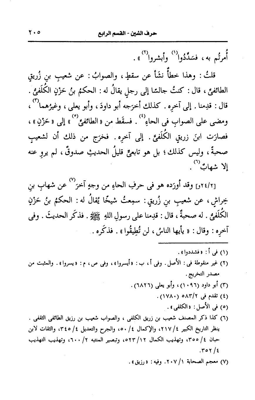 كذلك أَخرجه أَبو داود، وأَبو يعلى وغيرهما ومضى على الصواب في الحاء فسقط من الطائفي إلى حزن فصارت بن زريق الكلفي إلى آخره فخرج من ذلك أن لشعيب صحبة.
