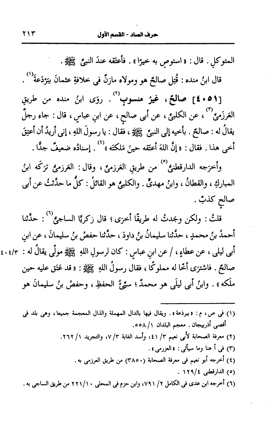 رَوَى ابن مَنْدَه من طريق العرزمي، عَن الكلبي، عَن أبي صالح، عَن ابن عباس قال جاء رجل يُقَالُ لَهُ: صالح بأخيه إِلَى النَّبِيِّ صَلى الله عَلَيه وسَلم فقال يا رسول الله أريد أن أعتق أخي هذا فقال إن الله قد أعتقه حين ملكته إسناده ضعيف جدا.