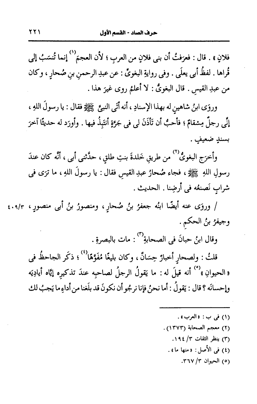قلت: ولصحار أخبار حسان، وكان بليغا مفوها ذكر الجاحظ في الحيوان أنه قيل له ما يقول الرجل لصاحبه عند تذكيره إياه أياديه وإحسانه قال يقول أما نحن فإنا نرجو أن نكون قد بلغنا من أداء ما يجب لك علينا مبلغا مرضيا.