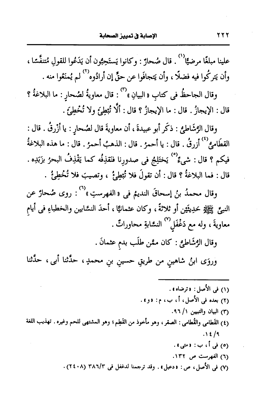 وقال الرُّشَاطِيُّ ذكر أَبو عبيدة أن معاوية قال لصحار يا أزرق قال القطامي أزرق قال يا أحمر قال الذهب أحمر قال ما هذه البلاغة فيكم قال شيء يختلج في صدورنا فنقذفه كما يقذف البحر بزبده قال فما البلاغة قال أن تقول فلا تبطىء وتصيب فلا تخطىء.