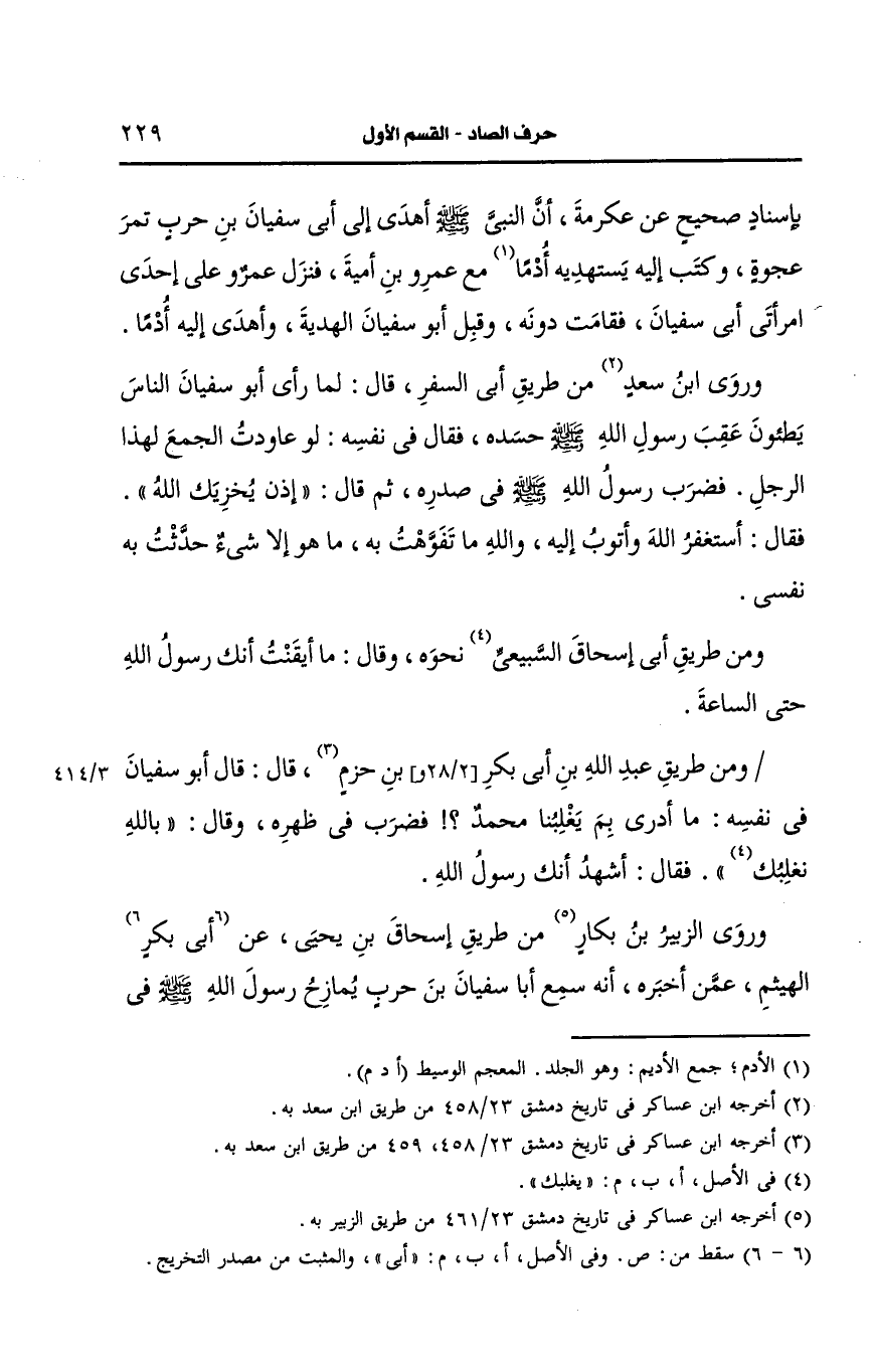 وروى ابن سَعْد أيضًا بإسناد صحيح، عَن عكرمة أَنَّ النَّبِيَّ صَلى الله عَلَيه وسَلم أهدى إلى أبي سفيان بن حرب تمر عجوة وكتب إليه يستهديه أدما مع عَمرو بن أُمَيَّة فنزل عَمرو على إحدى امرأتي أبي سفيان فقامت دونه وقبل أَبو سفيان الهدية وأهدى إليه أدما.