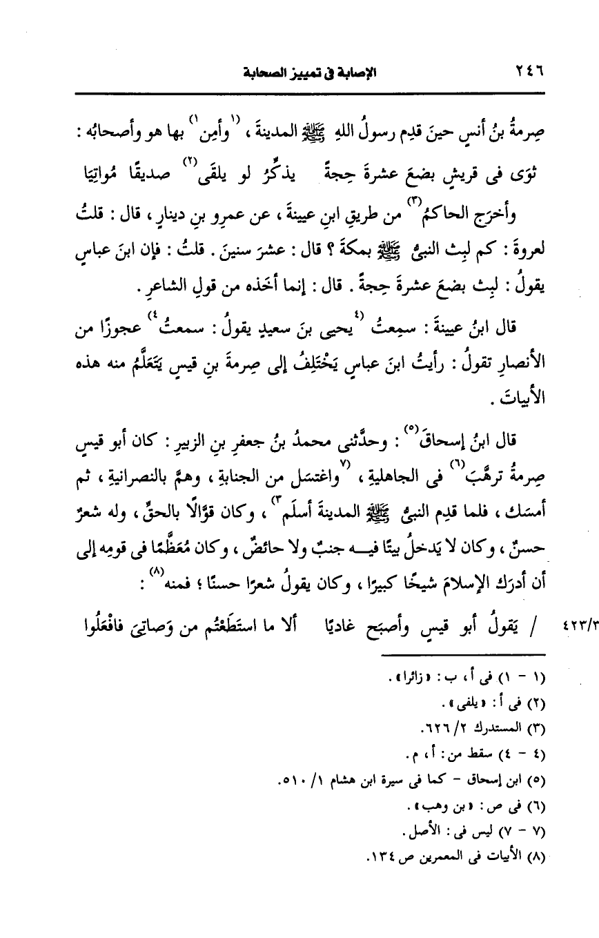 قال ابنُ عُيَيْنَةَ: سمعت عجوزا من الأنصار تقول رأيت بن عباس يختلف إلى صرمة بن قيس يتعلم منه هذه الأبيات.