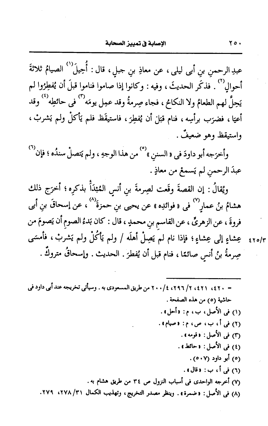 وأَخرجه أَبو داود في السُّنَن من هذا الوجه ولم يتصل سنده فإن عبد الرحمن لم يسمع من معاذ.، ويُقال: إن القصة وقعت لصرمة بن أنس المبدأ بذكره أخرج ذلك هشام بن عمار في فوائده، عَن يحيى بن حمزة، عَن إسحاق بن أبي فروة، عَن الزُّهْرِيّ، عَن القاسم بن محمد، قال: كان بدء الصوم أن يصوم من عشاء إلى عشاء فإذا نام لم يصل أهله ولم يأكل ولم يشرب فأمسى صرمة بن أنس صائما فنام قبل أن يفطر الحديث وإسحاق متروك.