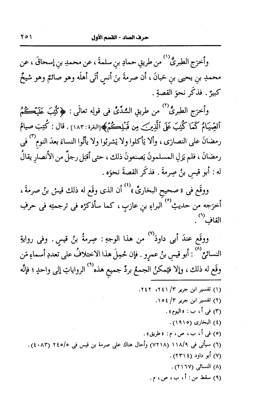 وأخرج الطَّبَرِي من طريق حماد بن سلمة، عَن محمد بن إسحاق، عَن محمد بن يحيى بن حبان أن صرمة بن أنس أتى أهله وهو صائم وهو شيخ كبير فذكر نحو القصة.