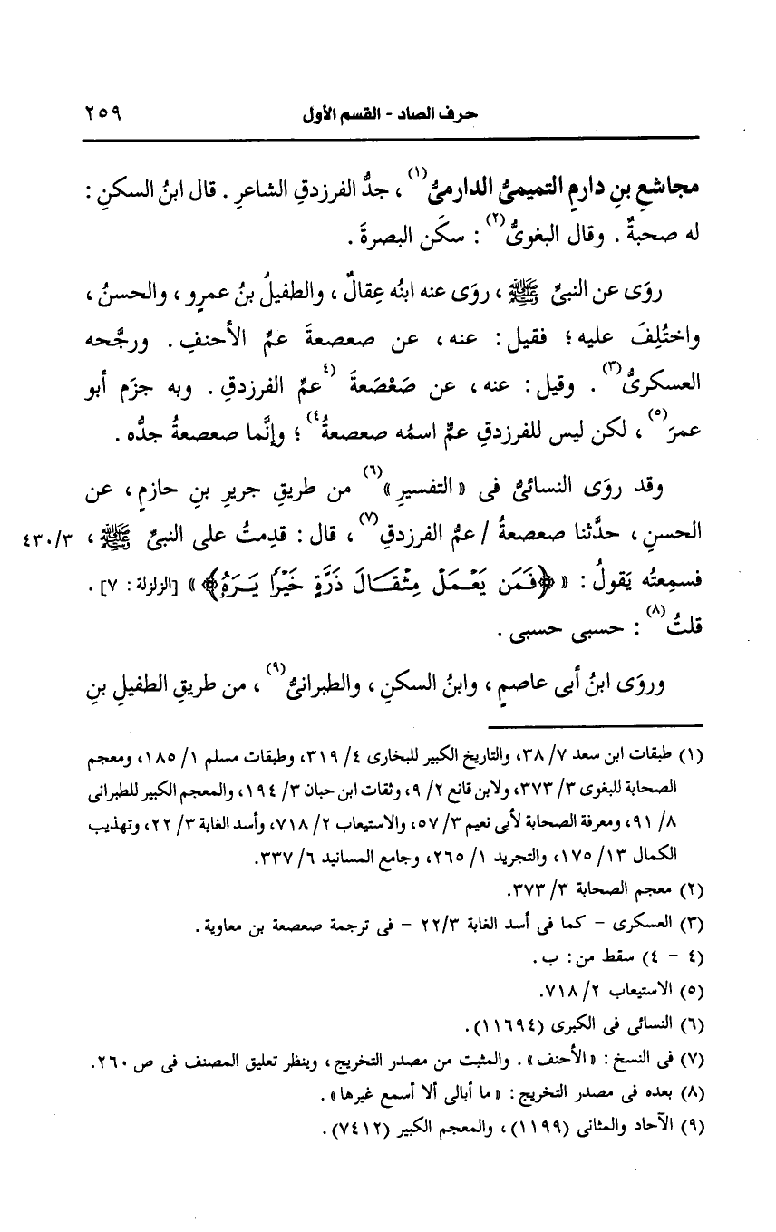 وقد روى النسائي في التفسير من طريق جريج بن حازم، عَن الحسن، حَدَّثنا صعصعة عم الأحنف قال قدمت على النَّبِيِّ صَلى الله عَلَيه وسَلم فسمعته يقول من يعمل مثقال ذرة خيرا يره قلت: حسبي حسبي.