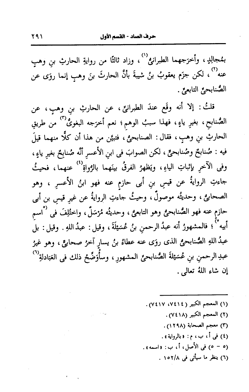قلت: إلا أنه وقع عند الطبراني، عَن الحارث بن وهب، عَن الصنابح بغير ياء فهذا سبب الوهم نعم أَخرجه البغوي من طريق الحارث بن وهب فقال الصنابحي فتبين من هذا أن كلا منهما قيل فيه صنابح وصنابحي لكن الصواب في ابن الأعسر أنه صنابح بغير ياء وفي الآخر بإثبات الياء ويظهر الفرق بينهما بالرواية عنهما فحيث جاءت الرواية، عَن قيس بن أبي حازم عنه فهو بن الأعسر وهو الصحابي وحديثه موصول وحيث جاءت الرواية، عَن غير قيس عنه فهو الصنابحي وهو التابعي وحديثه مرسل.