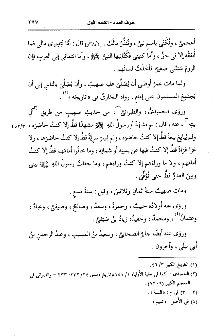 وروى الحميدي والطبراني من حديث صهيب من طريق الستة عنه قال لم يشهد رسول الله صَلى الله عَلَيه وسَلم مشهدا قط إلا كنت حاضره ولم يبايع بيعة إلا كنت حاضرها ولم يسر سرية قط إلا كنت حاضرها ولا غزا غزاة إلا كنت فيها، عَن يمينه أو شماله وما خافوا إمامهم قط إلا كنت أمامهم ولا ما وراءهم إلا كنت وراءهم وما جعلت رسول الله صَلى الله عَلَيه وسَلم بيني وبين العدو قط حتى توفي.