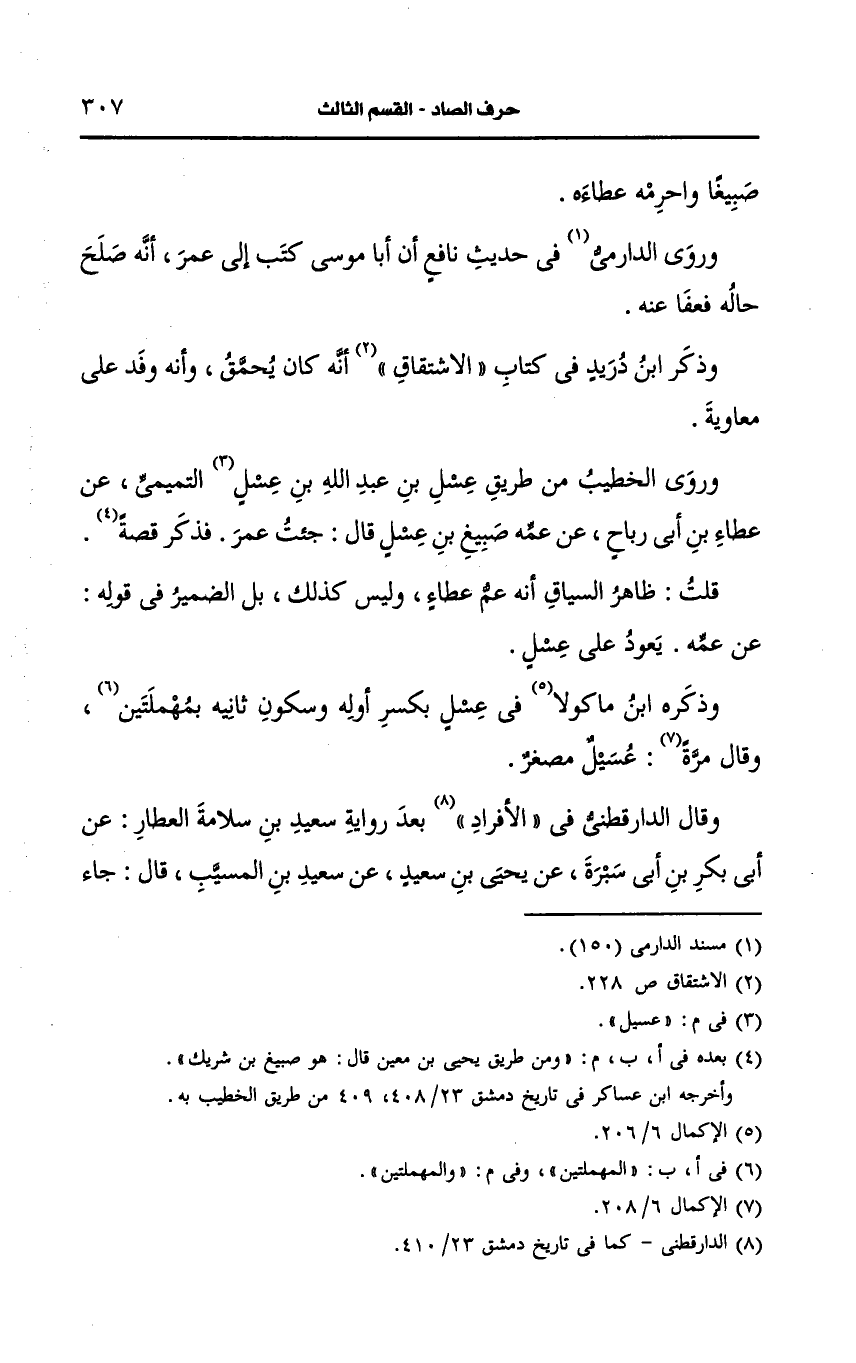 وروى الخطيب من طريق عسل بن عَبد الله بن عسيل التميمي، عَن عطاء بن أبي رباح، عَن عمه صبيغ بن عسل قال جئت عمر فذكر قصة.