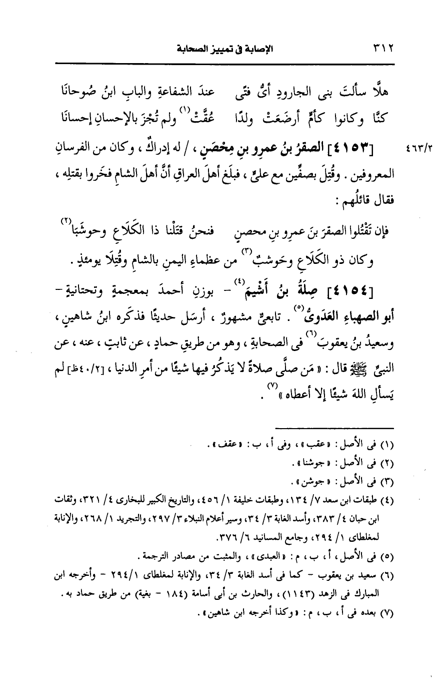 4154- صلة بن أشيم يوزن أَحمد بمعجمة وتحتانية أَبو الصهباء العبدي.