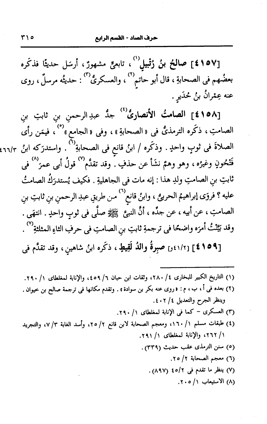 وَقد تَقدَّم في قول أبي عمر في ثابت بن الصامت ولد هذا إنه مات في الجاهلية فكيف يستدرك الصامت عليه فروى إبراهيم الحربي، وابن قانع من طريق عبد الرحمن بن ثابت بن الصامت، عَن أَبيه، عَن جَدِّه أَنَّ النَّبِيَّ صَلى الله عَلَيه وسَلم صلى في ثوب واحد انتهى.
