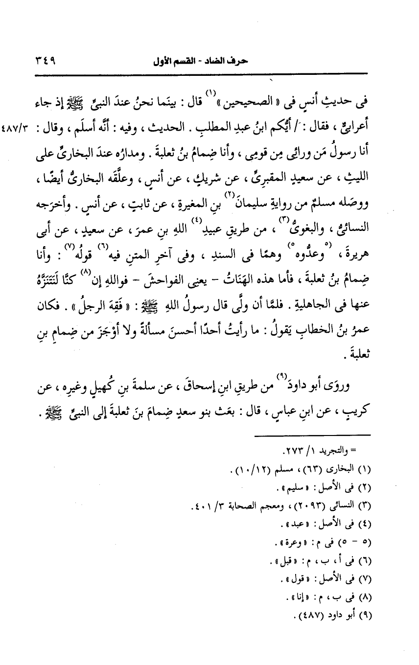 وروى أَبو داود من طريق ابن إِسحَاق، عَن سلمة بن كهيل وغيره، عَن كريب، عَن ابن عباس قال بعث بنو سعد ضمام بن ثعلبة إِلَى النَّبِيِّ صَلى الله عَلَيه وسَلم فذكره.