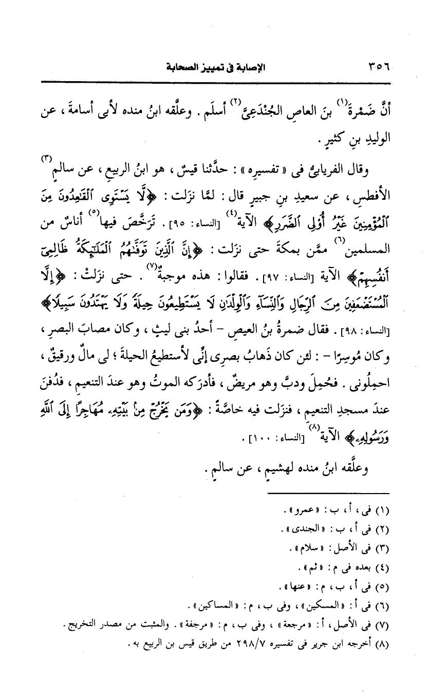 وأخرج ابن مَنْدَه من طريق يزيد بن أبي حكيم، عَن الحكم بن أبان، عَن عكرمة سمعت بن عباس يقول طلبت اسم رجل في القرآن وهو الذي خرج مهاجرا إلى الله ورسوله وهو ضمرة بن أبي العيص قال ابن مَنْدَه: ورواه أَبو أَحمد الزبيري، عَن محمد بن شريك، عَن عَمرو بن دينار، عَن عكرمة، عَن ابن عباس، قال: كان رجل يُقَالُ لَهُ: ضمرة أو بن ضمرة فذكر الحديث.