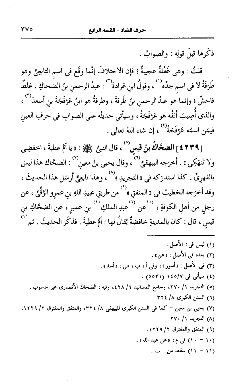 استدرَكَه في التجريد وهذا تابعي أرسل هذا الحديث وقد أَخرجه الخطيب في المتفق من طريق عبيد الله بن عَمرو الرقي، عَن رجل من أهل الكوفة، عَن عَبد الله بن عمير، عَن الضحاك بن قيس، قال: كان بالمدينة خافضة يُقَالُ لَهَا: أم عطية فذكر الحديث ثم أخرج من طريق المفضل بن غسان العلائي، في "تاريخه" قال سألت بن مَعِين، عَن حديث حدثناه عَبد الله بن جعفر الرقي، عَن عبيد الله فذكر هذا فقال الضحاك بن قيس هذا ليس هو بالفهري.