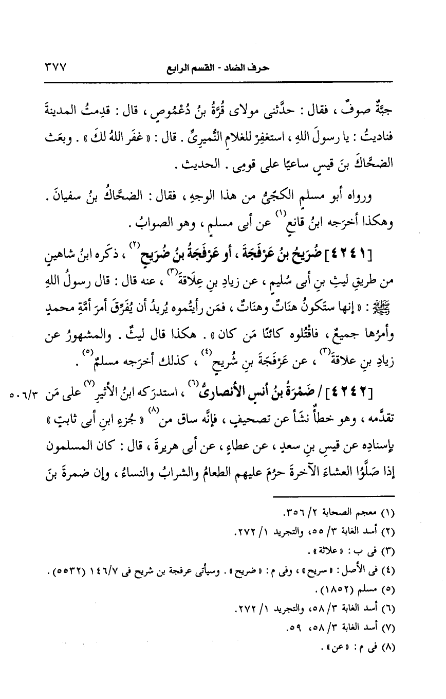 استدرَكَه ابن الأَثِير على من تقدمه وهو خطأ نشأ، عَن تصحيف فإنه ساق، عَن جزء بن أبي ثابت بإسناده، عَن قيس ابن سَعد، عَن عطاء، عَن أبي هريرة، قال: كان المسلمون إذا صلوا العشاء الآخرة حرم عليهم الطعام والشراب والنساء وإن ضمرة بن أنس، الأَنصارِيّ غلبته عينه فنام الحديث في نزول قوله تعالى وكلوا واشربوا حتى يتبين لكم الآية هكذا قال والصواب صرمة بن أنس وقد مضى القول فيه في القسم الأول وبيان الاختلاف فيه وبالله التوفيق.