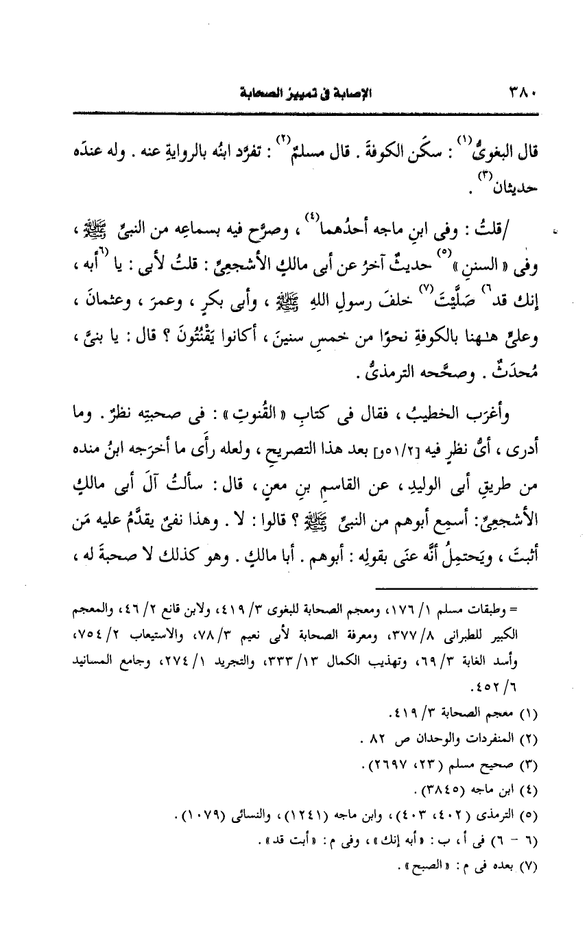 وصححه التِّرمِذيّ وأغرب الخطيب فقال في كتاب القنوت في صحبته نظر وما أدري أي نظر فيه بعد هذا التصريح ولعله رأى ما أَخرجه ابن مندة من طريق أبي الوليد، عَن القاسم بن معن قال سألت آل أبي مالك الأشجعي أسمع أبوهم من النَّبيّ صَلى الله عَلَيه وسَلم قالوا لا وهذا نفي يقدم عليه من أثبت ويحتمل أنه عني بقوله أبوهم أبا مالكي وهو كذلك لا صحبة له إنما الصحبة لابنه والله أعلم.