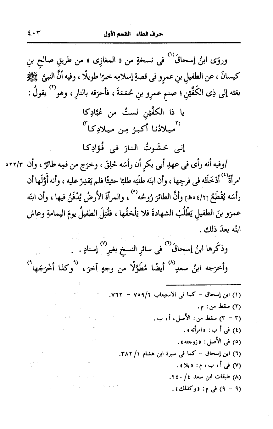 ورَوى ابن إسحاق في نسخة من المغازي من طريق صالح بن كيسان، عَن الطفيل بن عَمرو في قصة إسلامه خبرا طويلا وفيه أَنَّ النَّبِيَّ صَلى الله عَلَيه وسَلم بعثه إلى ذي الكفين صنم عَمرو بن حممة فأحرقه بالنار ويقول: